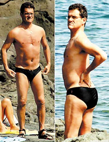 英國媒體近日曝光了卡佩羅攜妻子勞拉去西西里島度假的照片,英格蘭新帥卡佩羅僅著一條黑色游泳褲,另外眼鏡和沙灘鞋是僅有的隨身物品。照片清晰地顯示出了卡佩羅雖年過花甲,卻仍然擁有令人艷羨的健壯身材。