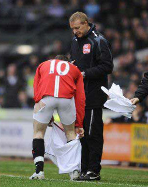 雖然沒(méi)有進(jìn)球,但曼聯(lián)10號(hào)極其勇猛,比賽中他在與對(duì)方的一次沖撞中,連球褲也被撕爛。魯尼被迫在邊線外上演一幕現(xiàn)場(chǎng)更換褲子的花絮。從現(xiàn)場(chǎng)畫(huà)面看,魯尼不僅球褲破了,連打底的內(nèi)褲也被撕爛,臀部還有明顯的傷痕。功夫不負(fù)有心人,賣力的魯尼終于創(chuàng)造了一次左路傳中,幫助小小羅射入了制勝一球。小小羅進(jìn)球后,魯尼不禁飛身?yè)涞剿谋成洗蠛稹?/p>