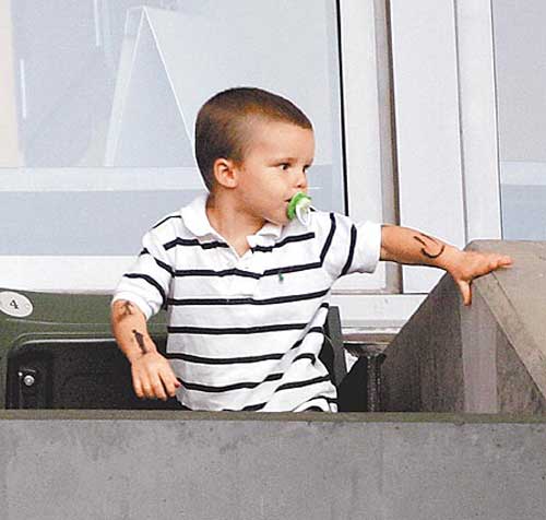 中新網(wǎng)6月10日電 據(jù)臺灣媒體報道,足壇“萬人迷”貝克漢姆(David Beckham)是紋身狂,身上至少有12處刺青。“有其父必有其子”,小貝愛子克魯茲雖然只有3歲,也在手臂上貼滿了刺青貼紙。英國的《太陽報》形容他是“迷你版貝克漢姆”,但小貝恐怕不能學(xué)愛子含奶嘴的可愛樣子。
