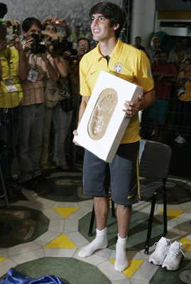 昨日,正隨巴西國家隊備戰世界杯預選賽的卡卡抽空在著名的里約熱內盧馬拉卡納足球場參加一個名人紀念館活動。在那里,前世界足球先生和金球獎得主卡卡留下了自己的“足跡”,米蘭頭號球星正式成為馬拉卡納足球場名人堂的成員,也是第94位進入這一名人堂的足球名人。