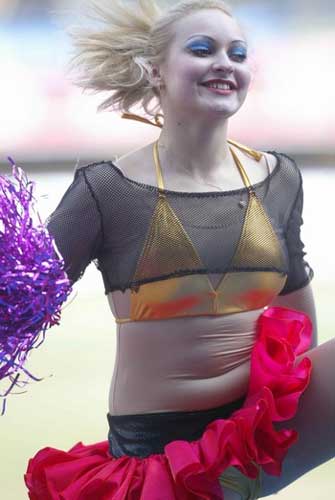 大連大概不懂不能搶戲份的道理,把首輪戰也搞得像春晚一樣很紅很喜慶,洋妞助威團的獻藝大有喧賓奪主之意。握有中超開幕式導演聘書的或許很不屑這草臺班子,但我作為一名正直的觀眾卻很喜歡這至少握上去更實實在在的一圈腰間贅肉——哈,小腹婆,很可愛!