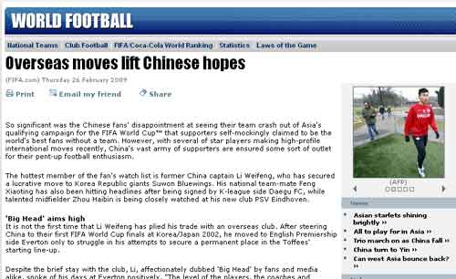中新網2月27日電 馮瀟霆、周海濱的自由轉會海外,堪稱中國足壇的“博斯曼”橫空出世。他們不僅引爆了國內足壇,也吸引了FIFA的注意。國際足聯官方網站上也對此事進行了關注。