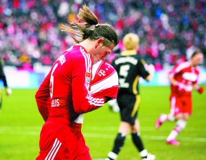 最先掀起“愛情風暴”的是當下狀態大勇的法國球星里貝里,他本場特意穿上粉紅球鞋戴上紅色手套,活脫脫一個紅色小精靈。第29分鐘他的任意球直接破門,為球隊很快扳平了比分。這也是里貝里連續第6場聯賽進球,激動的他在進球后特別親吻了寫有妻子瓦希芭(Wahiba)名字的左手腕繃帶。半場結束前,中衛德米凱利斯收獲進球。阿根廷人進球后令人意外地撿起球將它包進球衣里,做出孕婦的姿勢。原來這一幕是獻給他已經懷孕的女友伊萬格利娜的。下半場,拜仁的進球風暴并未停歇,而表達愛意的慶祝動作也似乎可以傳染。克洛澤將里貝里的傳中球頂入后,伸出三根手指,指代妻子希爾維婭和雙胞胎兒子。此后托尼和奧多配合后破門,意大利人也特別親吻著左手,原來大拇指上戴有未婚妻瑪塔送他的戒指。