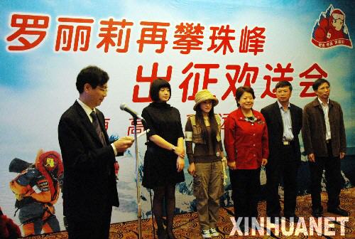3月26日,羅麗莉(左三)在出征儀式上。當日,27歲的廣西女孩羅麗莉第二次登珠峰出征歡送會在廣西南寧舉行。羅麗莉從2002年到2007年,五次攀登了三座8000米以上的山峰,還曾創造了兩年連登三大高峰的奇跡。2006年羅麗莉曾嘗試登頂珠峰,但由于氧氣面罩漏氣等原因在登到海拔86