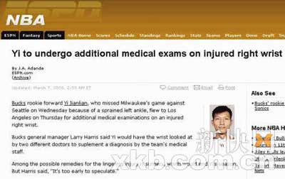 據ESPN報道,飛赴洛杉磯檢查傷病的易建聯遭遇壞消息,他受傷的右手手腕傷病波及韌帶,一旦確診韌帶傷情,很可能面臨接受手術的事實。