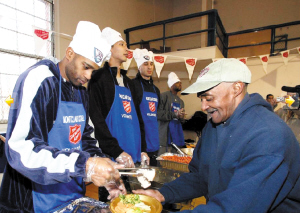 昨天,易建聯(左圖左一)和卡特、哈里斯等籃網隊員一起來到新澤西的一家教堂,在感恩節到來之際,向當地社區貧困居民分發食品。在活動現場,易建聯身著便裝頭戴一頂繡有籃網標志的廚師帽發放食物,整個活動過程中易建聯始終面帶微笑,并和獲贈食物的居民親切交談。