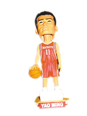 賽后,姚明得到一箱自己的搖頭娃娃。見蘭德里看得眼饞,姚明笑著吆喝:“100美元一個。”