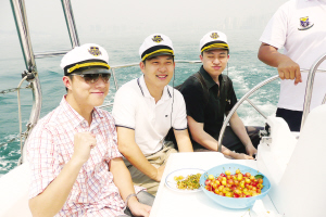 中午時分,帆船與游艇會合,帆船手們紛紛登上游艇。不少人開始跟船長學駕游艇,其實學習倒在其次,主要樂趣在于戴著船長帽,坐在駕駛室里擺出駕船POSE留影。更多人開始在艇內飆歌,美少女冠軍棋手宋容慧是“歌中高手”,而古力演唱實力更勝一籌。但當滿盆紅色的大螃蟹端上桌時,誰都沒有心思做吃以外的事了。