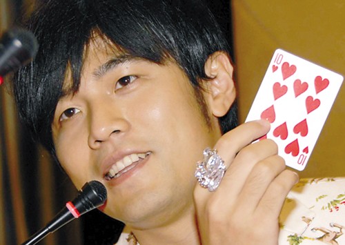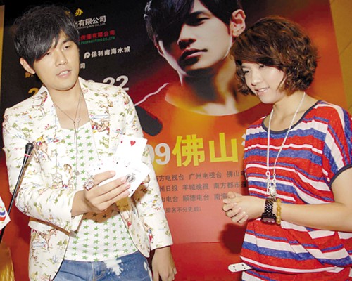 昨日下午,周杰倫以“雪碧”品牌代言人身份,來到廣州新長隆酒店舉行千人大型歌迷見面會,剛剛拍完電影《刺陵》的周杰倫似乎是在沙漠地帶待得太久,不僅主動要求記者提些“奇怪的問題”,而且有問必答,還在現場分別為歌迷與記者連玩了數場撲克魔術。他十分肯定地承認自己玩魔術的確有“喧賓奪主”的嫌疑,但仍自夸“魔術玩得太好,我還想明年準備做一場大型魔術主題演唱會”。