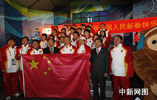 中新網溫哥華2月10日電 (記者 夏宇華 賴海隆)中國冬奧代表團今天在雨中舉行了升旗儀式,正式成為本屆冬奧會大家庭成員。升旗儀式后,中國代表團團長劉鵬帶領代表團成員展開橫幅高聲向全體國人送上新春祝福。