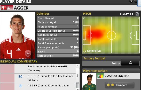 第6分鐘,阿格成功防守,喀麥隆隊前鋒韋博突破后進攻被破壞而惱羞成怒,對其犯規。第20分鐘,喀麥隆隊中場大將恩瑪納禁區前沿拿球突破,沒有能夠突破阿格的防守。40分鐘時,喀麥隆隊前場反擊,不過他們的直傳球被阿格成功攔截。下半場第7分鐘,埃托奧前場傳球恩瑪納,后者禁區前一帶想尋求突破,不過阿格的貼身防守非常成功,球被破壞出了邊線。下半場第14分鐘,喀麥隆隊后場搶斷發動反擊,埃托奧禁區內帶球摔倒了,不過主裁判并沒有吹罰丹麥隊球員犯規,因為阿格的防守非常干凈。1分鐘后,阿格倒地鏟球,將埃托奧的帶球斷下,化解了門前險情。