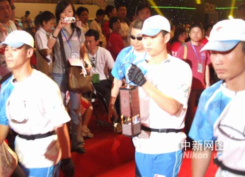 三名圣火使者將圣火引至火種燈,杭州站圣火盆熄滅。