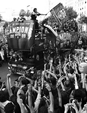 許多球迷也身穿巴薩隊服,揮舞巴薩隊旗,不斷高呼“巴薩!巴薩!”“冠軍!冠軍!”整個巴塞羅那沉浸在狂喜之中。
