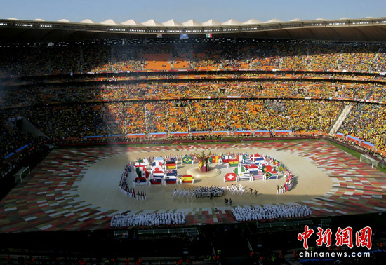 中新社約翰內斯堡6月11日電 2010年南非世界杯11日在約翰內斯堡的足球城體育場揭開神秘面紗,充滿非洲元素和韻味的開幕式將非洲大陸悠久的文明和嶄新的現代文化完美展現,給世界一個驚艷的亮相。