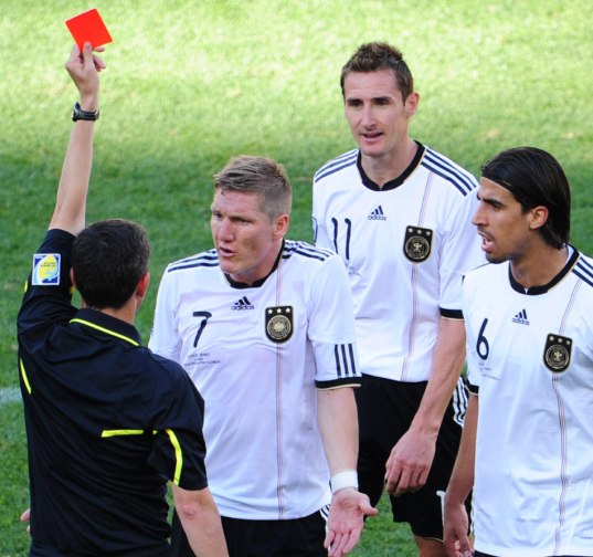 在上半場(chǎng),德國(guó)隊(duì)還占據(jù)場(chǎng)上的主動(dòng)。不過(guò)克洛澤在第12分鐘就吃到一張黃牌,而其隊(duì)友也不斷被西班牙隊(duì)出示黃牌。第37分鐘,克洛澤在防守斯坦科維奇時(shí),先鏟倒了球,這是一個(gè)可判可不判的犯規(guī),一般的裁判只會(huì)給個(gè)口頭警告。結(jié)果主裁判烏迪亞諾竟在未口頭警告的情況下,直接就出示第二張黃牌將其罰下。