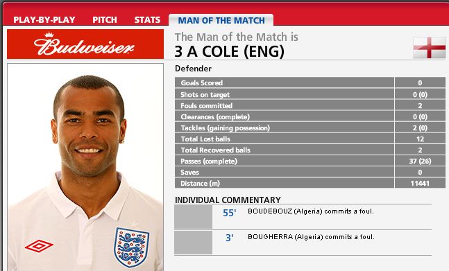 中新網6月19日電 在今天凌晨結束的一場世界杯小組賽中,英格蘭隊邊后衛阿什利·科爾被評為全場最佳球員。不過從賽后國際足聯公布的技術統計來看,這位“全場最佳”的數據可以用“慘不忍睹”來形容。