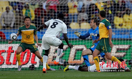 中新社勒斯滕堡6月19日電 首場慘敗的澳大利亞隊今天迎戰小組賽首輪唯一取勝的非洲球隊加納,在主力前鋒科威爾被罰下場的不利局面下,他們堅守住了1比1平的戰果。