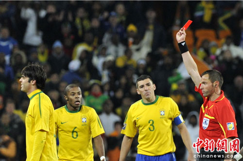 隨后的比賽,雙方球員情緒更加急躁,第88分鐘場(chǎng)上局面終于失控。卡卡用胳膊肘擊了凱塔,累計(jì)兩張黃牌被罰下場(chǎng)。最終在經(jīng)過(guò)3分鐘補(bǔ)時(shí)之后,3-1的比分沒(méi)有變化,巴西隊(duì)取得了與科特迪瓦隊(duì)的勝利。此役戰(zhàn)罷,已經(jīng)兩戰(zhàn)兩勝的巴西隊(duì)已經(jīng)提前出線。
