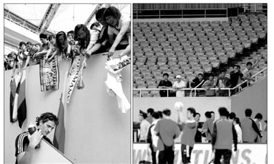然而,這樣的熱烈氛圍隨著中國隊的到來消散殆盡。當德國隊退場、中國隊進場時,近2000名球迷竟然像潮水退潮一般,轉眼就迅速地隨德國隊一同離場。一名女球迷在撤退時向同伴高喊:“中國隊來了,快跑!”最終堅持留在體育場看中國隊訓練的球迷,竟然只有屈指可數的8個人。(記者鄭小龍)