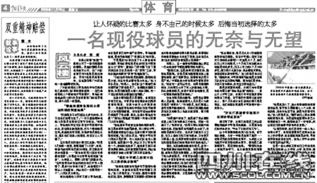 今年9月2日進(jìn)行的中甲聯(lián)賽中,四川隊(duì)坐鎮(zhèn)主場(chǎng)四川大學(xué)體育場(chǎng)對(duì)陣青島海利豐,客場(chǎng)作戰(zhàn)的海利豐3球領(lǐng)先,但該隊(duì)隊(duì)員卻在最后時(shí)刻連續(xù)三次吊射本方球門,不得不讓人懷疑有人在操控比賽。中青報(bào)這篇《一名現(xiàn)役球員的無奈與無望》的報(bào)道就從這場(chǎng)比賽切入正題,報(bào)道中稱,一名不愿意透露姓名的川足隊(duì)員說,“我也想盡早知道這場(chǎng)球的調(diào)查結(jié)果,我不是希望青島被罰降級(jí)或四川留在中甲,我是真想知道能不能從這場(chǎng)比賽中找到假球的證據(jù)。”