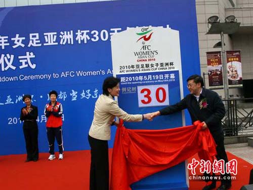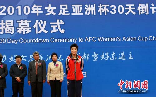 中新網成都4月20日電(記者 楊杰)20日下午,2010年女足亞洲杯30天倒計時揭幕儀式在成都舉行,中國足協副主席薛立、成都市副市長傅勇林、中國女子足球隊教練陳金剛、中國女子足球隊隊長畢妍,以及泰國駐成都總理事孫建功等出席了揭幕儀式。