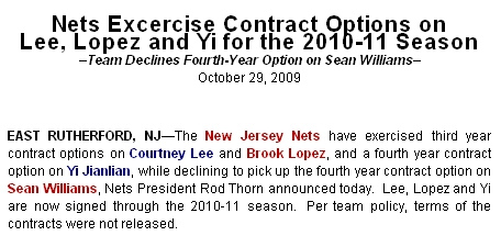 籃網(wǎng)此次執(zhí)行的是易建聯(lián)的第四年合同選項,因為阿聯(lián)與雄鹿簽訂了2+2的新秀合約,即前兩年的固定保障加兩年合同選項。所以易建聯(lián)至少會為網(wǎng)隊效力到2010-11賽季結束。