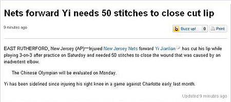 中新網12月7日電 北京時間昨日,據美聯社報道,易建聯在新澤西當地時間周六早上的一場三對三訓練中被隊友用手肘打破了上嘴唇。因為傷勢嚴重,竟被縫了50針。