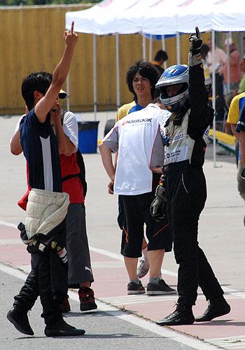 在事故發生后,韓寒鉆出已經面目全非的賽車,用盡全力狠狠地摔了下車門,然后走下賽道。掙扎著駛回賽道的王睿,也在幾圈后遭遇裁判黑旗而退出比賽。當王睿將車開會維修區時,已經脫下一半賽服的韓寒,一邊打電話,一邊上前安慰王睿。隨后,兩人非常默契地同時伸出中指,高高地指向天,并各自轉了360度,以便讓現場的更多觀眾和記者看到。此舉立刻引起軒然大波。