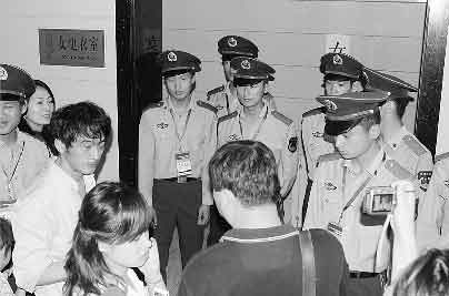 郭晶晶是否真的去找吳敏霞了?這個記者并不清楚,不過據記者了解吳敏霞不出席新聞發布會是因為害怕被“誤傷”。在郭晶晶第一次離開新聞發布會現場時,記者也跟了出去。吳敏霞當時剛剛接受完央視的采訪正準備走進更衣室,但此時竟然有一位簽名的男FANS跟著吳敏霞走進了更衣室,不過好在現場武警反應迅速,將他“揪了”出來。見現場形勢已經非常混亂,武警索性集體站在了女更衣室的門口,一位現場工作人員邊打著電話,邊嚷著“守好,誰都不讓進去”。