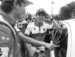 韓寒的支持者顯得更加有組織性,在昨天的發車現場,記者甚至看到了幾位打著“南京寒迷會”橫幅的帥哥美女,不過韓寒似乎有點不太“合作”,直到發車儀式即將開始的時候,才出現在自己的賽車旁,這讓現場的韓迷頗有些失望。