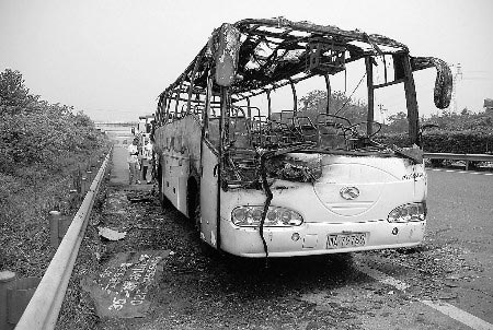昨日上午11時(shí)30分,幾名交警正在現(xiàn)場(chǎng)指揮拖車(chē)把這輛燒得面目全非的客車(chē)拖走。記者看到,這輛車(chē)牌為川A79769的客車(chē)已被燒成了黑漆漆的光架子,車(chē)內(nèi)30多把座椅也只剩下鐵架,右側(cè)的車(chē)頭裂了一條一米多長(zhǎng)的縫隙,車(chē)尾的后擋板完全被燒毀,露出了車(chē)內(nèi)的零件。地面更是一片狼藉,黑水橫流,空氣中彌漫著一股濃烈的焦臭味。