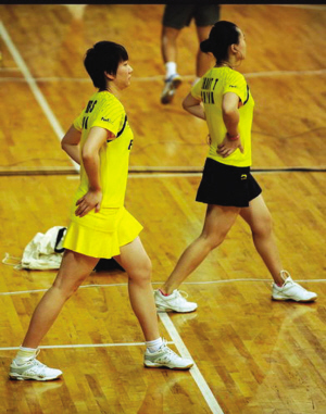 網(wǎng)球場上女選手穿著短裙打球已經(jīng)蔚然成風(fēng),羽毛球場上的美少女們還處于“遮遮掩掩”的狀態(tài),穿裙子比賽的遠遠少于穿褲裝的。不過也有勇于“嘗試”的,昨日中國隊里的女雙組合張亞雯和趙婷婷、成淑和趙蕓蕾都穿上了裙裝——張亞雯、趙婷婷穿的是黑衣紅裙,成淑、趙蕓蕾則是黃色裙子。不知是否是穿著裙裝更利落,兩對組合都輕松挺進女雙八強。