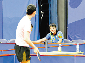 20日下午,王皓在場邊觀看隊友張繼科與雷振華的練習賽。王皓看了一會兒之后,忍不住回過頭盯著彭陸洋和文佳的練球。沒過一會,張繼科與雷振華休息,王皓干脆扭過頭來,看起彭陸洋和文佳的練球,他看得非常入神,一直默不作聲,也一直沒有換過坐姿。