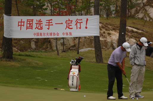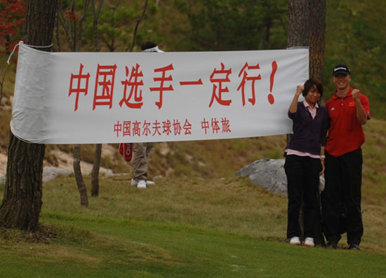 中新網(wǎng)首爾9月25日電 (張哉麟) 2009“韓國KEB銀行”中韓職業(yè)高爾夫球巡回賽韓國站比賽今日在韓國OSTAR高爾夫球俱樂部繼續(xù)進行,球場邊有橫幅上面用中文寫著“中國選手一定行!”,有工作人員還在這橫幅面前,與中國選手合影留念。