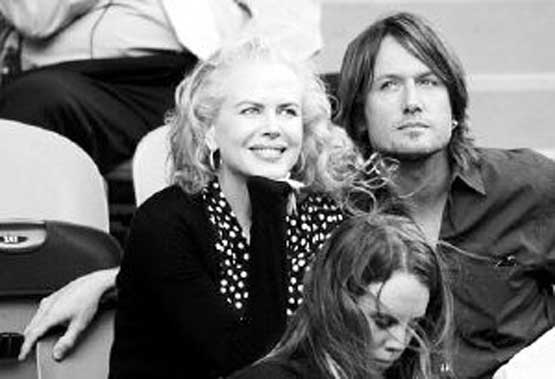 在昨天休伊特和德約科維奇的比賽中,休伊特的同胞妮可.基德曼和她的丈夫、鄉村歌手凱西.厄本一同現身觀眾席。作為好萊塢著名的時尚人士,觀看網球比賽的妮可也盡顯時尚本色,黑底白點的連衣裙讓這位金發女郎顯得既高貴又大方。圖為妮可和丈夫在觀看比賽。