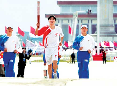 邁著“冠軍步伐”,以慢于任何一次跑步練習(xí)的速度緩慢前行,昨天上午11時50分,在北京2008年奧運(yùn)會圣火歡迎儀式暨火炬接力啟動儀式上,火炬手代表、中國著名運(yùn)動員劉翔從胡錦濤主席手中接過“祥云”火炬,跑過金水橋,成為奧運(yùn)火炬接力中國境內(nèi)第一人。