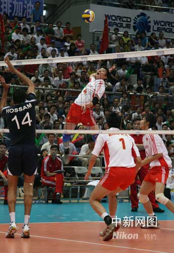 比賽開始后,中國隊的陣容依舊和上周相同,主攻沈瓊、崔建軍,副攻于大偉、邊洪敏,接應二傳袁志,二傳焦帥以及自由人任琦。