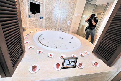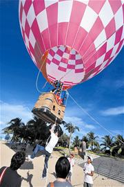 彩排中一個巨大的熱氣球無疑是最大焦點,氣球上寫著“云中漫步”四個大字,待熱氣球緩緩升起,記者才看明白,原來是楊云和伴娘孫曉姣兩人將在空中來一趟“云中漫步”。具體過程是,楊云和孫曉姣在工作人員的幫助下,熱氣球從百米開外的一處小碼頭“漫步”到愛情廣場上空,等待楊威和國家體操隊的5名“黃金”伴郎的到來。