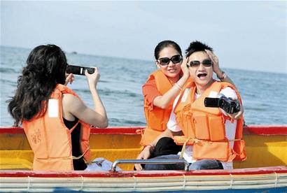 當然,昨日彩排的時候,5位伴郎還沒有抵達三亞,而且楊威的海上旅程和楊云的空中旅程分開彩排。因此,在這一環節,楊威、楊云和孫曉姣同坐一條艇,而本報兩名記者和楊威、楊云的隨行人員則客串伴郎分乘另外三條艇,來了一次海上“漫步”。