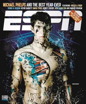 菲爾普斯憑借在北京奧運會中的曠世表現,接連登上美國《體育畫報》和ESPN雜志封面。ESPN對飛魚圖片進行了十分“前衛”的處理,赤裸上身的菲爾普斯纏滿花紋,酷似文身,看上去頗有幾分詭異。
