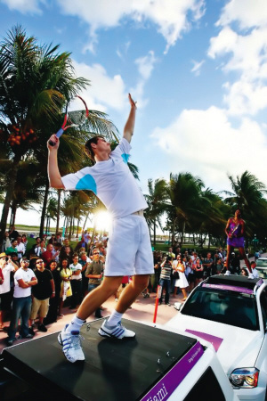 邁阿密當地時間3月23日,為了宣傳索愛公開賽,大威和穆雷分別站到一輛車上,打起了“車上網球”。