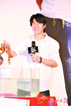 成龍雖未到場,房祖名卻請來了時下最火的明星“章魚哥”保羅來為新專輯的成績做預測。房祖名分別將“金曲獎”和“銷量突破50萬”兩個心愿牌放在兩個被罩住的魚缸前,并許愿說,“得‘金曲獎’比較現實點,章魚哥你還是選‘金曲獎’這邊的魚缸吧!”揭開幕布,“章魚哥”果然沒讓房祖名失望。他高興得立即從缸里撈起“章魚哥”,猛地一陣愛撫,隨后發(fā)現保羅沒什么精神時,房祖名緊張大呼“趕緊送‘章魚哥’去醫(yī)院治病!”(記者 程雪超 攝影報道)