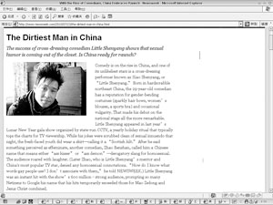 《新聞周刊》回顧了小沈陽參加去年中央電視臺春節聯歡晚會的情景說,那天晚上,他抖的“包袱”里雖然沒有黃段子,但這名新人還是穿了一條裙子——蘇格蘭裙。在這臺晚會的6億多觀眾面前,小沈陽一炮走紅。成千上萬的網民去網絡上搜索他的資料,他的點擊率一下子超過了很多中國名人。