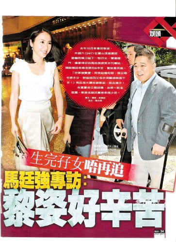 記者問他有沒有進產房陪太太,馬廷強說:“我沒進產房。黎姿要打麻醉針,加上我拄著拐杖,不是很方便,所以留在產房外等。她生完BB后從手術室出來,我就立刻去看她。”