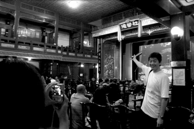 晚上7點半,演出正式開始,德云社元老邢文昭先生表演單口相聲《文昭關》。此時上座率剛剛過半,觀眾都很安靜地聽相聲,邢先生抖包袱后,大家也是試探著“噫”了幾聲,反倒是邢先生挺放得開,“叫好就痛快點”。德云社門前停著于謙的座駕,但在后臺,記者沒有看到他和郭德綱的身影。