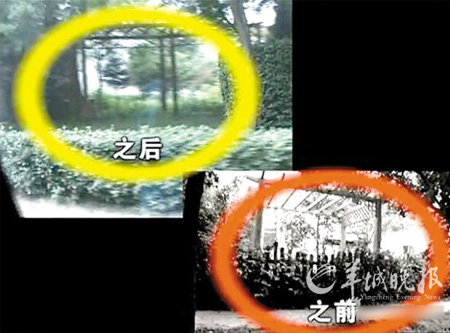 昨天上午11時,記者再次來到郭宅后院,記者發現3個小時之前仍然存在的侵占公共綠地的綠色木柵欄已經被拆除大部分,周邊只剩下部分被拔下來的柵欄殘骸。但是院內假山、水池,以及綠色涼亭仍然存在。據了解,之前城管部門曾經確認此部分也屬違建。