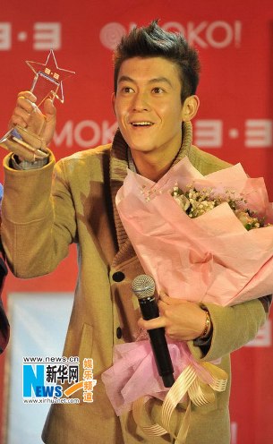 陳冠希10月28日在北京參加商業活動,他獲贈大捧鮮花人氣依舊居高不下,現場獻唱時他額頭冒青筋,拼命哄歌迷挽救人氣。還不忘大談與女友戀情自我炒作,并稱自己從未說出過退出或者離開娛樂圈。