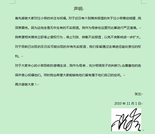 中新網11月2日電 近日,有消息稱大S未婚夫汪小菲曾離婚,并有一女,對此,汪小菲母親、俏江南董事長張蘭女士對其子汪小菲已婚離異的不實報道發出聲明。內容如下: