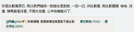 阿Sa和鄭中基雖然決定離婚,但從未說出具體原因。在“Sa霆戀”曝光后,輿論開始傾向男方,還有消息稱鄭中基“癡心等待阿Sa回心轉意”。阿嬌卻第一個跳出來反駁,她在微博中寫道:“真的,公道自在人心!你(阿Sa)不說出離婚原因,對他已經算仁至義盡了!錯不在你,你要知道我們都很愛你的!”此微博被瘋狂轉發,網友紛紛向阿嬌追問幕后真相,阿嬌最終刪掉此文,并且大發牢騷:“我想微博這東西真不適合我。”倒是阿Sa比較豁達,在微博上留言給阿嬌,稱“神馬都是浮云”,不用太在意。