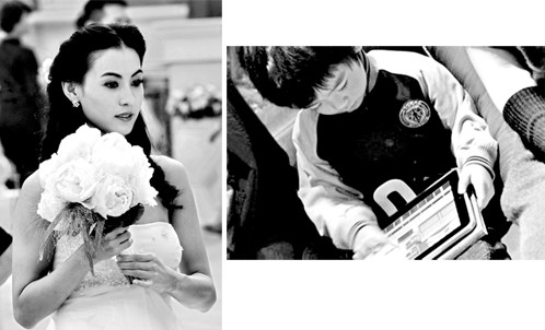 當天拍攝的是《最強囍事》中的重頭戲:搶親。杜汶澤好不容易將張柏芝追到手,哪知就在婚禮即將舉行的一刻,對張柏芝情深意切的古天樂突然出現在現場,不由分說就要將張柏芝搶走。一見身披婚紗的張柏芝,就不由令人想起她和謝霆鋒的幸福婚姻生活。提起謝霆鋒,張柏芝立刻就笑了,甜蜜表示:“霆鋒來探班過,但因為有戲在身,才呆了15分鐘就走了。”雖然只有15分鐘,但對于張柏芝來說,已經很是滿足。張柏芝坦言,那么多年沒有拍戲,剛剛站到鏡頭前的一刻,確實有些不習慣和緊張,還好有老公在身邊支持自己:“他是很靦腆的人,在片場話雖然不多,已經是很關心的舉動了,我很開心。”
